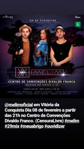 A banda Melim, formada pelos irmãos Diogo, Rodrigo e Gabriela Melim, se apresentará em Vitória da Conquista, no próximo dia 08 de fevereiro. O trio promete um show com uma mistura temperada de pop, reggae, MPB, além é claro das canções de sucesso da banda.