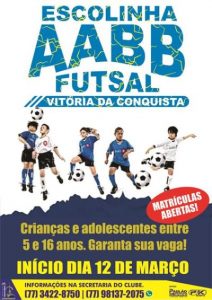 Já estão abertas as matrículas para a escolinha de Futsal da Associação Atlética do Banco do Brasil (AABB), que tem como objetivo principal o ensino da arte de jogar futsal brincando e de forma divertida, respeitando sempre a individualidade de cada um.