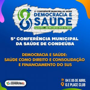 Entre os dias 04 e 05 de abril, a Prefeitura de Condeúba realizará a 5ª Conferência Municipal de Saúde. O evento, que acontecerá no G.E Place Club, tem como objetivo fortalecer a participação da sociedade nas decisões da gestão pública; é um momento para tratar de questões relacionadas à área e refletir sobre qual tipo de saúde o município quer ter.