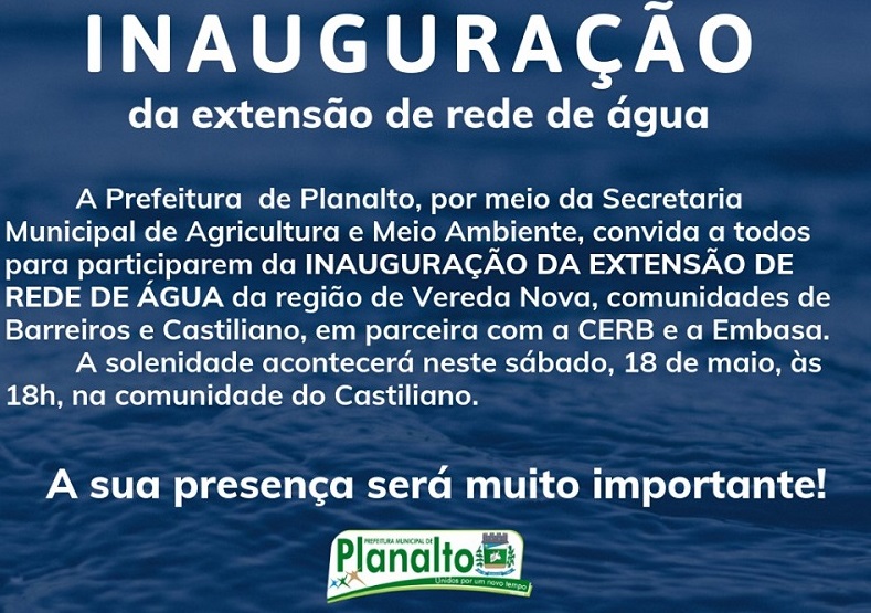 A Prefeitura Municipal de Planalto realizará neste sábado, dia 18, a inauguração da extensão de rede de água da região de Vereda Nova, contemplando as comunidades de Barreiros e Castiliano
