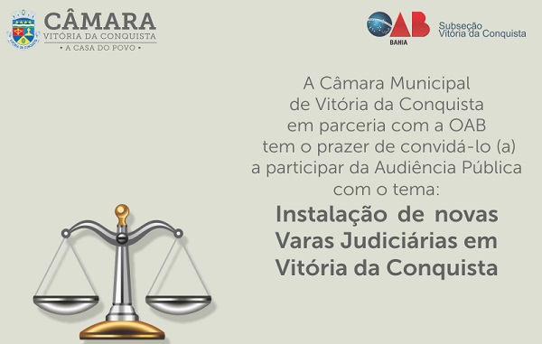 Nesta quinta-feira, 13, às 19:00, a Câmara de Vereadores promove audiência pública onde serão discutidas a criação de novas varas para o poder judiciário no município de Vitória da Conquista. O evento é de iniciativa do vereador Edivaldo Ferreira Júnior (MDB).