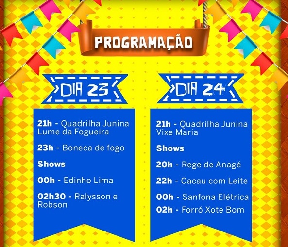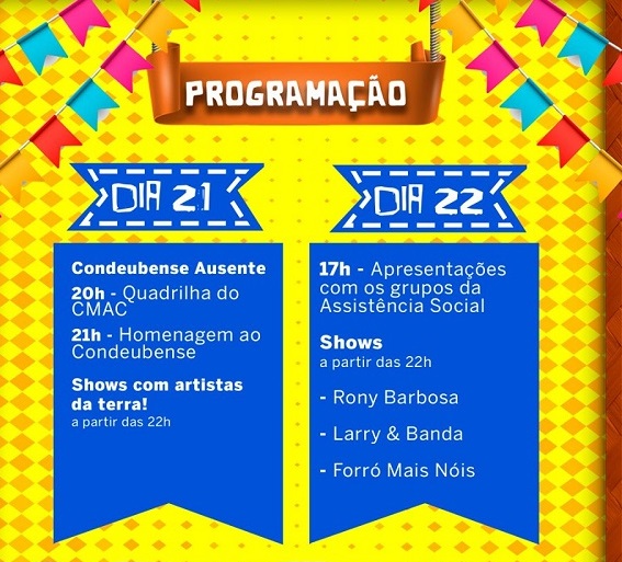 Chegou a época que para muita gente é a melhor do ano! Por isso, a Prefeitura Municipal de Condeúba tem a honra de convidar toda a população para o Arraiá Tradição – xote, xaxado e baião! Curta uma programação completa do dia 21 até o dia 24.