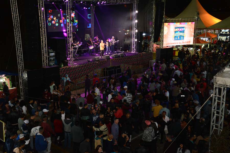 Nem mesmo a garoa fina que insistia em cair na noite deste sábado (21) e as baixas temperaturas intimidaram o público, que foi prestigiar o segundo dia do Arraiá da Conquista. Como disse dona Regina Oliveira, “a festa é excelente. Por isso, até a chuva é bem-vinda e as atrações são ótimas para dançar; com esse friozinho então…”