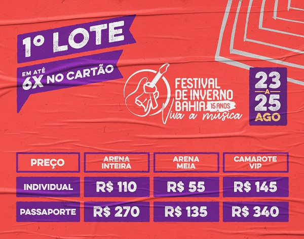 Em 2019, o Festival de Inverno completa 15 anos. Serão três noites incríveis de celebração à música e aos encontros de todas as tribos. Confira quem fará a festa no Palco Principal: na sexta, 23, se apresentam Dilsinho, Frejat, e Marília Mendonça; já no sábado, 24, é a vez de O Grande Encontro, Iza, Ivete Sangalo e Léo Santana; fecham o festival, no dia 25, Nando Reis, Wesley Safadão e Anitta. Os ingressos do 1º lote já estão à venda e o pagamento pode ser feito em dinheiro, cartão de débito e/ou crédito (exceto HiperCard), com possibilidade de parcelamento em até 6x.