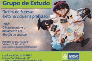 Interessados em ampliar seus conhecimentos e melhorar seus relacionamentos pessoais e profissionais podem participar do Grupo de Estudo “Ordens do Sucesso – êxito na vida e na profissão”. O Serviço de Psicologia, Organizacional e do Trabalho, ligado à Secretaria Municipal do Trabalho, Renda e Desenvolvimento Econômico (Semtre), está com as inscrições abertas até o dia 29 deste mês para adesão ao projeto.