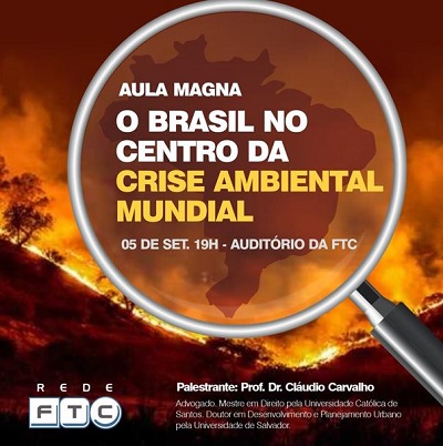 A Aula versará sobre o tema “O Brasil no Centro da Crise Ambiental Mundial”, e acontecerá no Auditório da FTC, às 19h.