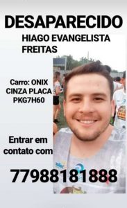 A irmã de Hiago informou que ele está desaparecido desde as 22h da última quarta-feira (07). Ele dirige um Chevrolet Onix, cor cinza escuro, placa PKG7H60.