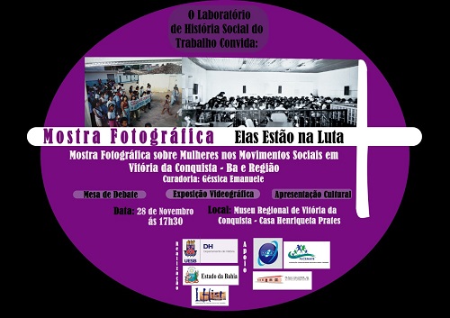 Acontece, no dia 28 de novembro, às 17h30, no Museu Regional de Vitória da Conquista, a abertura da exposição Elas Estão na Luta. Com a curadoria de Géssica Emanuelle, estudante do curso de Cinema e Audioisual da Uesb, a mostra fotográfica é uma promoção do Laboratório de História Social do Trabalho da Uesb (LHIST) e tem por objetivo dar visibilidade e debater a presença de mulheres em assembléias, movimentos de rua e em espaços e tempos de sociabilidade associados aos movimentos sociais de Vitória da Conquista e região, na segunda metade do século XX.