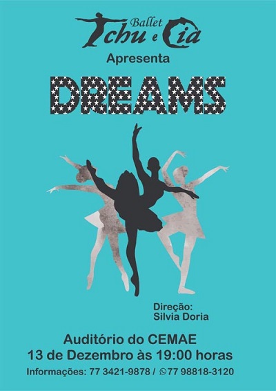 Vinte coreografias serão apresentadas durante o espetáculo ‘ Dreams’ , que será realizado no próxima 13 de dezembro, em Vitória da Conquista, pela companhia de dança Ballet Tchu e Cia. O tema do festival deste ano será Dreams, que significa sonhos. Segundo a professora e diretora, Silvia Doria,, as coreografias serão apresentadas em diversas modalidades de dança como Ballet Clássico, Jazz e Contemporâneo, numa noite cheia de sonhos encantados. “Estamos muito felizes em poder promover mais um evento como esse, apresentado o resultado de um trabalho que fazemos com muita dedicação e amor. Será uma noite de sonhos”, concluiu Sílvia Doria.
