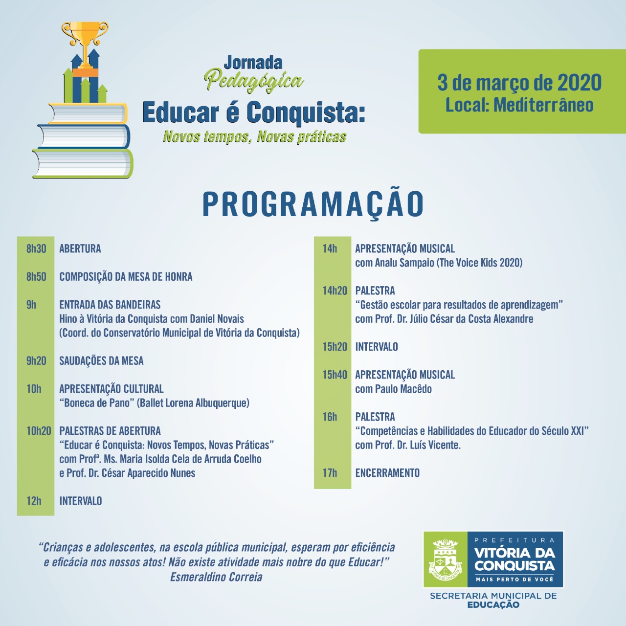 Além das palestras, a Jornada contará com homenagens a alunos que foram destaque em 2019, apresentações do Ballet Lorena Albuquerque e da cantora conquistense Analu Sampaio, participante do The Voice Kids 2020. Todos os professores da Rede Municipal de Ensino estão convocados a participar da Jornada Pedagógica. São esperados cerca de 2 mil profissionais.