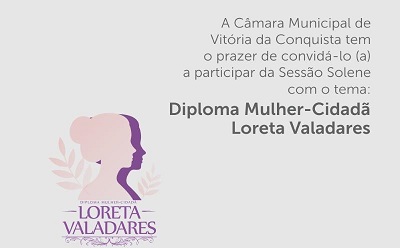 O Diploma – Todos os anos, seguindo o rito da Resolução nº 41/2005, a CMVC homenageia com o Siploma Mulher Cidadã Loreta Valadares mulheres que, no município de Vitória da Conquista, tenham oferecido ou oferecem contribuição relevante à defesa dos direitos das mulheres e questões de gênero.