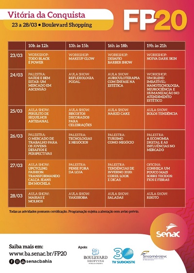 A programação contará com oficinas, palestras, workshops e consultorias gratuitas nos mais diversos segmentos. As áreas apresentadas durante o evento estão no rol de tendências para o mercado em 2020 – Gastronomia, Beleza, Tecnologia da Informação, Moda, Saúde, Comunicação, Comércio, Gestão e Educação a distância. As atividades presentes na grade de programação incluem certificado de participação. As inscrições devem ser realizadas através do site: www.ba.senac.br/FP20. As vagas são limitadas à lotação do local.