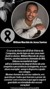 Faleceu o jovem estudante do curso de física da Universidade Estadual do Sudoeste da Bahia, Willian de Jesus Santos.