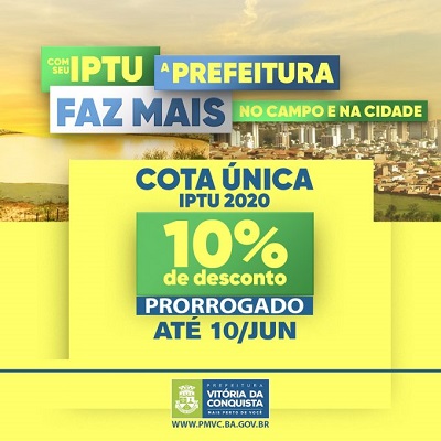 A Prefeitura Municipal de Vitória da Conquista prorrogou o prazo para o desconto no pagamento em cota única do Imposto Predial e Territorial Urbano (IPTU). O desconto de 10% será dado para quem quitar o imposto até o dia 10 de junho.