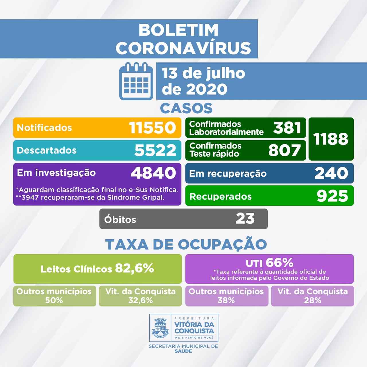 Conquista: 1.188 casos confirmados; 925 recuperados e 240 em recuperação