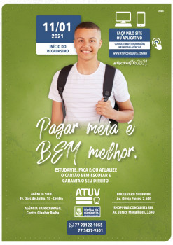 Confira nota da ATUV sobre o Bilhete Eletrônico Estudantil: “COMUNICAMOS a data do Cadastro e Recadastro 2021 do Bilhete Eletrônico Estudantil, a iniciar em 11/01/2021 aos discentes vinculados às Redes de Ensino Particular, Estadual, Municipal e Federal do Município de Vitória da Conquista. Para tanto, SOLICITAMOS o envio das Litas dos Alunos matriculados por e-mails institucionais, ou seja, da própria instituição de ensino nos e-mails cadastro@atuvconquista.com.br e atuv.cadastro@gmail.com .