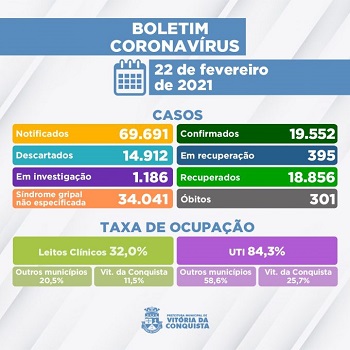 299º óbito – Homem de 58 anos, morador do bairro Candeias, sem comorbidades relatadas. Foi internado no dia 14 de fevereiro no Hospital Geral de Vitória da Conquista (HGVC), onde faleceu em 20 de fevereiro.