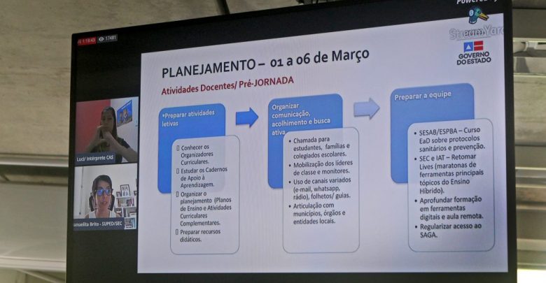 Segundo Jerônimo Rodrigues, a pré-jornada prepara os professores para a jornada pedagógica, que antecede o início do ano letivo. “É o início de uma capacitação para uso das ferramentas tecnológicas, uso da plataforma, os conteúdos, quais são os cuidados que nós temos e o acompanhamento, como será o ano”. No dia 8 de março, completa o secretário, “no Dia da Mulher, nós iniciaremos a jornada pedagógica e, no dia 15 as aulas, para os dois anos, para 2020 e 2021, portanto esta semana é importante para a gente”.