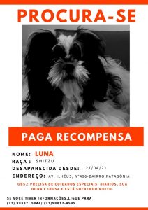 Uma idosa de Vitória da Conquista está à procura da sua cadela que desapareceu, nas imediações da Rodoviária, em Vitória da Conquista, no último dia 27 de abril. A dona, que está muito triste com o desaparecimento de sua cadela que atende como Luna, explica que o animal precisa de cuidados diários especiais.