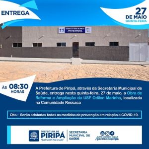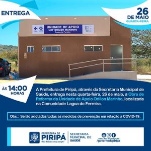 A começar, no dia 26 de maio (quarta-feira), será inaugurada, às 14h00, a Obra de Reforma da Unidade de Apoio USF Odilon Marinho, localizada na Comunidade Lagoa do Ferreira. E no dia 27 (quinta-feira), às 8h30, será inaugurada a Obra de Reforma e Ampliação da USF Odilon Marinho, na Comunidade Ressaca.
