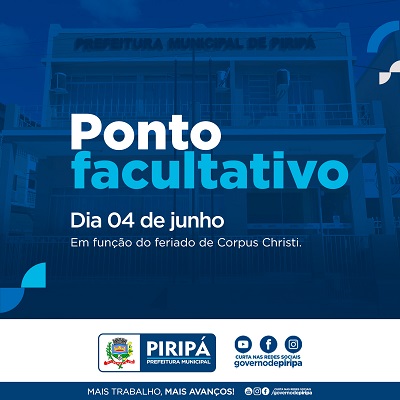 O prefeito de Piripá, Flávio Rocha, decretou ponto facultativo nas repartições públicas municipais no dia 04 de junho (sexta-feira) em decorrência do feriado de Corpus Christi.