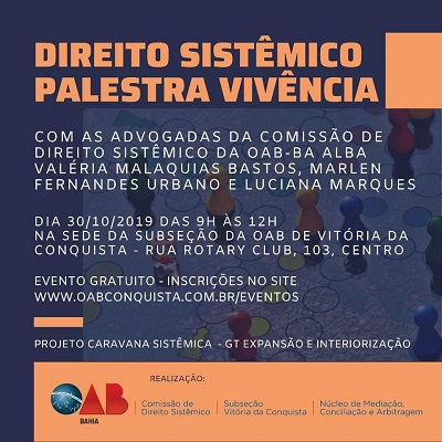 A OAB Subseção Vitória da Conquista receberá a Caravana Sistêmica com o evento “Direito Sistêmico – Palestra e Vivência”. A ação é promovida pela Comissão Estadual de Direito Sistêmico da OAB Bahia e tem como público alvo advogados, estudantes, Defensores Públicos, Promotores, Juízes, servidores públicos do judiciário, especialmente aqueles que atuam na gestão de conflitos.