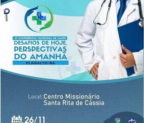 A Prefeitura de Planalto, por meio da Secretaria de Saúde, convida a população para a 6ª Conferência Municipal de Saúde que acontecerá no dia 26 de Novembro, às 08:00 horas no Centro Missionário Santa Rita de Cássia, com o tema: O SUS que queremos: Desafios de Hoje, perspectivas do amanhã.