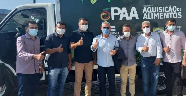Em ato realizado nesta semana, em Salvador, o prefeito Flávio Rocha, acompanhado do vice-prefeito Cristiano Santos, do secretário municipal de Agricultura, Jurandi Costa, e dos vereadores Maurício Rocha e Jovino Jesus, recebeu das mãos do secretário de Justiça, Direitos Humanos e Desenvolvimento Social da Bahia (SJDHDS), Carlos Martins, e dos deputados Waldenor Pereira (federal) e Zé Raimundo (estadual), um caminhão baú isotérmico para ser utilizado no transporte de alimentos do Programa de Aquisição de Alimentos (PAA).