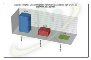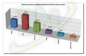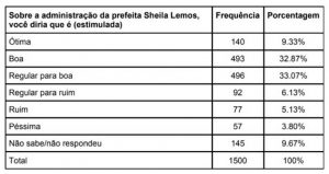 Já de acordo com o levantamento feito pela Gasparetto Pesquisas e Estatística (GPE), a administração de Sheila Lemos alcança 75,27% na soma das respostas ótima, boa e regular para boa. Outros 15,03% acham a administração regular para ruim, ruim ou péssima. Não responderam 9,67%.