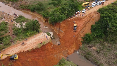 Os serviços emergenciais para a restauração da pista do KM 17, próximo ao acesso ao distrito de São Paulino, que liga o entroncamento da BR-101, em Itamaraju, ao distrito de Alho, foram concluídos neste domingo (12). Após autorizar o tráfego para motos e carros, a Secretaria de Infraestrutura da Bahia (Seinfra) permitiu a passagem de ônibus e caminhões pelo trecho da rodovia a partir da manhã de hoje. O deslocamento está sendo feito pelo desvio provisório, construído ao lado da pista rompida devido às chuvas no Extremo Sul baiano.