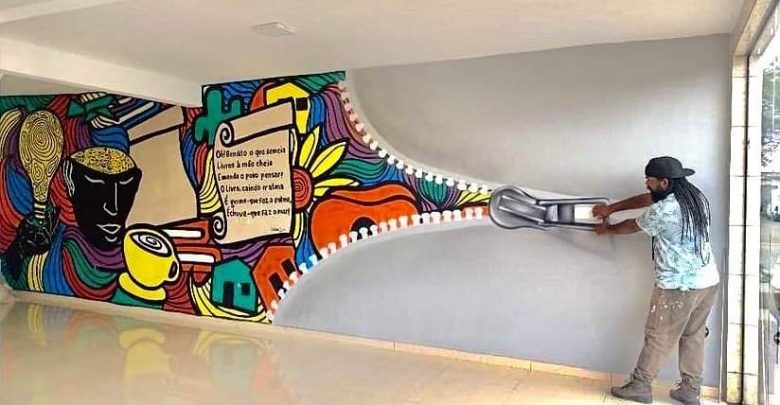 Tiano, que tem obras espalhadas pelo Brasil, assinou mais uma no município, dessa vez, nas paredes da Biblioteca Cultural Enock Ribeiro.