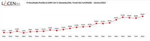 Conforme informou a Sesab, a cada 100 exames analisados, o número saltou de 6,55 testes positivos (em 1° de janeiro), para 53,92 (no dia 22 de janeiro). No dia 1º de janeiro, 171 novos casos foram validados pela Sesab. Já no sábado (22), o estado registrou 4.225 novos casos de coronavírus.