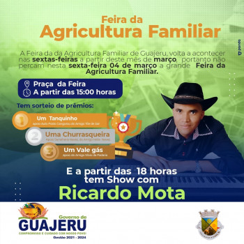 O governo de Guajeru através do Departamento de Agricultura informa a toda população que a Feira da Agricultura Familiar, deste mês de março em diante, acontece novamente às sextas-feiras, na Praça da Feira com início às 15 horas.