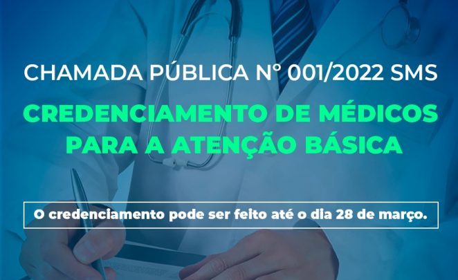 A Secretaria Municipal de Saúde (SMS) está com a Chamada Pública nº 01/2022 aberta para o credenciamento e eventual contratação de pessoa jurídica para operacionalização das atividades médicas nas Unidades Básicas de Saúde da zona urbana e rural do município.