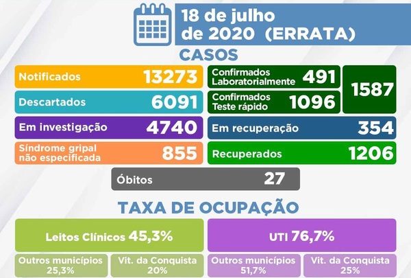 A 27ª morte por Covid-19 ocorreu em domicílio também na última quinta-feira (16): Uma mulher de 43 anos, moradora do bairro Campinhos/Loteamento Jatobá, que tinha como fator risco a obesidade. A coleta de amostra para exame laboratorial RT-PCR foi feita pós-morte e o resultado foi liberado ontem (17), com resultado detectável para a infecção.