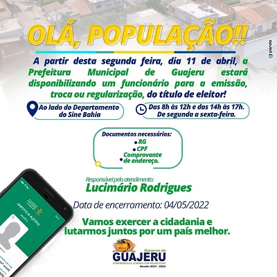 A partir desta segunda, 11 de abril, a Prefeitura Municipal de Guajeru estará disponibilizando um funcionário para a emissão, troca ou regularização, do título de eleitor!