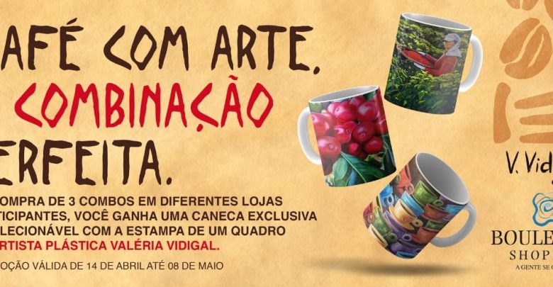 No Circuito do Café Boulevard, o cliente que consumir três combos em cafeterias diferentes, até o dia 08 de maio, ganha uma caneca especial estampada com uma pintura exclusiva da cafeicultora, empresária e artista plástica Valéria Vidigal. A troca pode ser feita em loja localizada ao lado da DMK Duo.