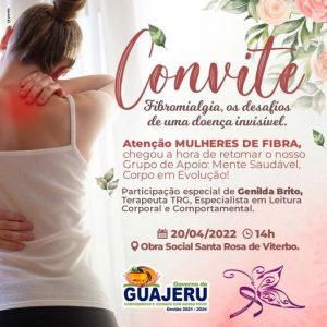 O Governo de Guajeru, através da Secretaria de Saúde, convida todas as mulheres Guajeruenses, com o diagnóstico de fibromialgia, para participar do GRUPO MULHERES DE FIBRA!