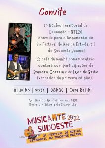 O Núcleo Territorial de Educação  (NTE20),  promove, nesta sexta-feira (01/07), o lançamento do II Festival de Música Estudantil do Sudoeste Baiano, que acontecerá em novembro deste ano. O Musicante é um festival de canção estudantil, fruto de uma emenda parlamentar, voltado para os estudantes da Rede Estadual de Educação Território Sudoeste Baiano, que vem cumprindo um importantíssimo papel de fomento à produção cultural e artística dos nossos estudantes por meio da música, trazendo visibilidade para essa produção musical, além de proporcionar a confluência de muitos talentos estudantis e desenvolver ações de formação artística e musical. Para o lançamento contaremos com a presença musical do vencedor da edição passada,  Igor de Brito, que cantará para os convidados juntamente com o cantor Evandro Correia,  abrilhantando esse momento de valorização da produção cultural da rede pública de educação do Sudoeste Baiano.