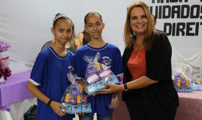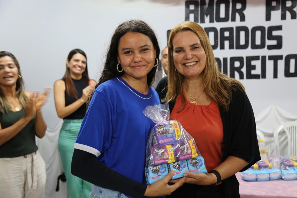 Uma nova realidade – A diretora da Escola Municipal Ridalva Correia, Italva Maria Aguiar Brito, fez um depoimento emocionante sobre a sua própria experiência com a pobreza menstrual, destacando a alegria de saber que essa não será a mesma realidade das suas alunas. “A gente fica contente pelo olhar da prefeita em relação às nossas meninas, porque a gente, que tá aqui dentro da escola, convive o dia a dia e sabe das dificuldades delas. Em média, custa 10 reais um absorvente, essa é a média. E para essas famílias, que vêm de uma carência muito grande, é inviável, elas não têm acesso”, reiterou.