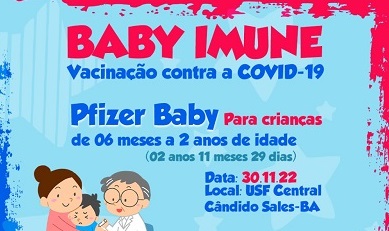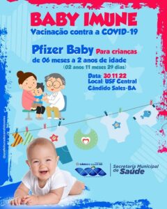 Crianças de 06 meses a 03 anos de idade, podem se vacinar contra a Covid-19, no município de Cândido Sales. A Secretaria Municipal de Saúde inicia nesta quarta-feira, 30, a vacinação de bebês com a vacina pediátrica Pfizer baby, que estará disponível na Unidade Central de Saúde.