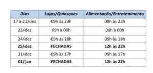 Na véspera de Natal (24), lojas, quiosques e Praça de Alimentação funcionam de 9h às 18h; e na véspera do Ano Novo (31), de 9h às 17h. No feriado de Natal (25) e no dia 1º de janeiro, as lojas e quiosques estarão fechados. Contudo, a Praça de Alimentação seguirá funcionando, das 12h às 22h.