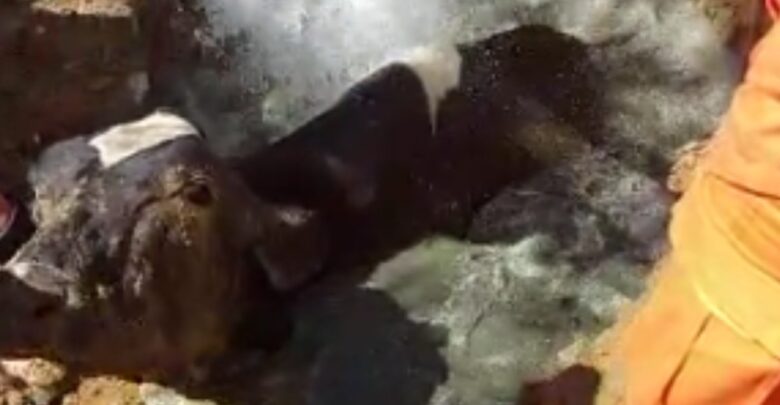 Vaca prenhe cai em fossa e é resgatada por bombeiros