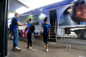 • Colégio Modelo Luís Eduardo Magalhães, em San Martin – carreta de atendimento estacionada na frente da unidade escolar