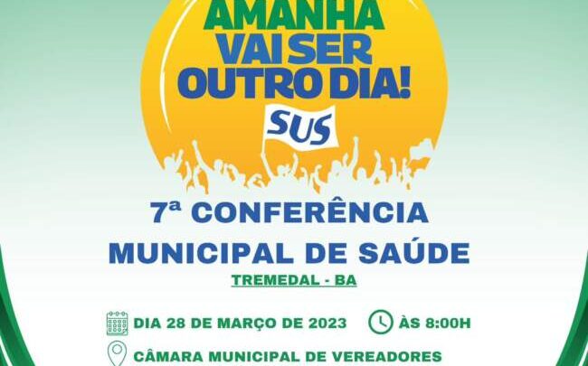 A Prefeitura de Tremedal, através da Secretaria Municipal de Saúd, e o Conselho Municipal de Saúde, realizarão, no próximo dia 28 de março, a 7ª Conferência Municipal de Saúde com o tema: “Garantir direitos e defender o SUS, a vida e a democracia”. O evento está previsto para iniciar às 8h e será realizado na Câmara de Vereadores.