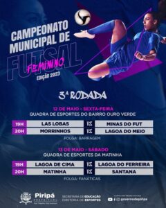 A partir desta sexta-feira (12/05), tem início a terceira rodada do Campeonato Municipal de Futsal Feminino Edição 2023. Na Quadra de Esportes Zé de Pedro, no Bairro Ouro Verde, às 19h, pelo Grupo 2, as Las Lobas enfrentam as Minas do Fut. E às 20h, joga Morrinhos e Lagoa do Meio. A equipe da Barragem folga nessa rodada.