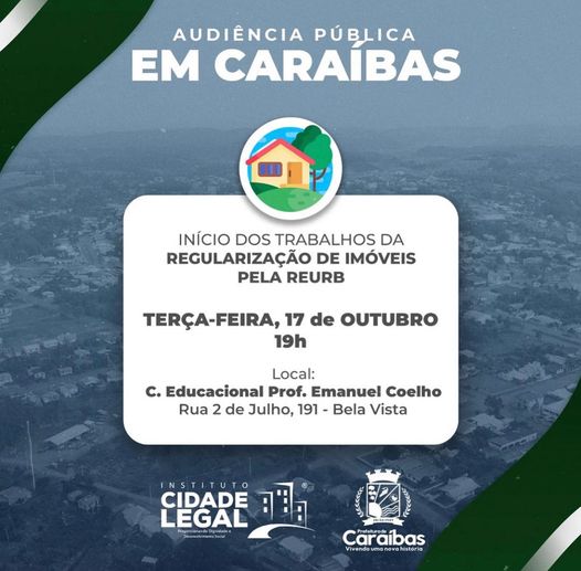 A Prefeitura de Caraíbas irá realizar uma audiência pública no auditório do CEC, com orientações para regularização do seu imóvel.