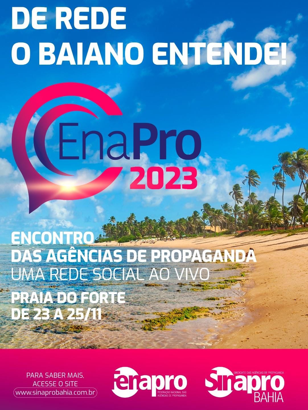 A Bahia será o palco de um dos maiores eventos de publicidade do país, o ENAPRO 2023, que acontecerá de 23 a 25 de novembro, no Espaço Baleia Jubarte, na Praia do Forte, um dos locais mais charmosos e paradisíacos do estado. Promovido pelo Sindicato de Propaganda do Estado da Bahia (Sinapro-Bahia), o encontro vai reunir agências de todo o país, veículos de comunicação, anunciantes, fornecedores, com a participação de grandes nomes nacionais e locais para discutir tendências, diversidade, inclusão, sustentabilidade e plataformas digitais.