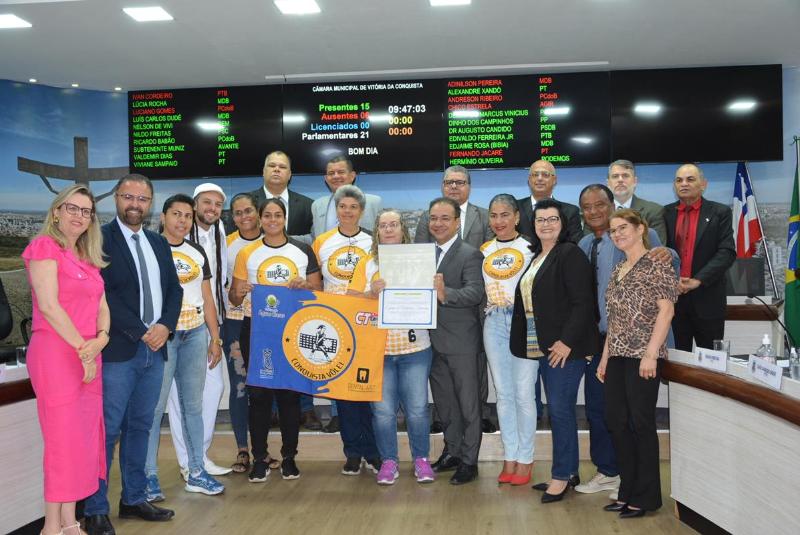 A Câmara Municipal de Vitória da Conquista prestou homenagem na manhã desta quarta-feira, 01, durante a sessão ordinária, à equipe de voleibol feminina de Vitória da Conquista, através da moções de aplauso n°83/2023. A homenagem foi de iniciativa do vereador Del. Marcus Vinícius (PODE).