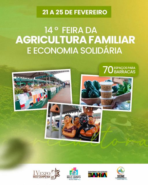 Vem aí mais uma grande novidade!!! Estamos falando da 14ª Feira de agricultura familiar e economia solidária que acontecerá durante IV Expo Belo Campo, a maior feira de todos os tempos, teremos espaço para mais de 70 barracas além de uma grande estrutura para todos os participantes!!! Vocês não podem perder, procure já a Secretária de Agricultura, Meio Ambiente e Expansão Econômica de Belo Campo e garanta a sua barraca!! Nada resiste ao trabalho!